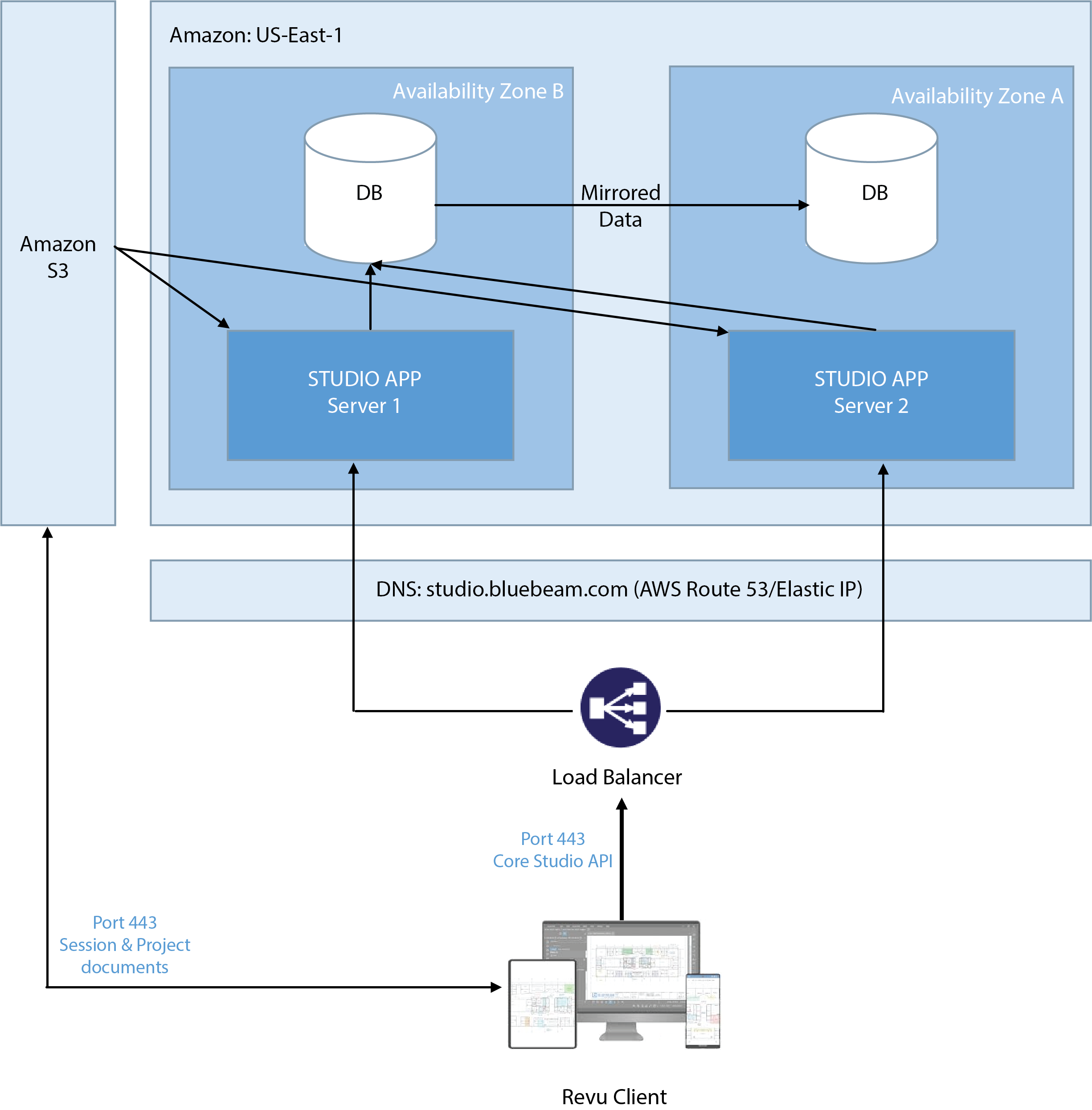 Darüber hinaus wird die Bluebeam Studio-Infrastruktur über mehrere AZs in einer Multi-AZ-Architektur innerhalb der AWS-Region bereitgestellt.