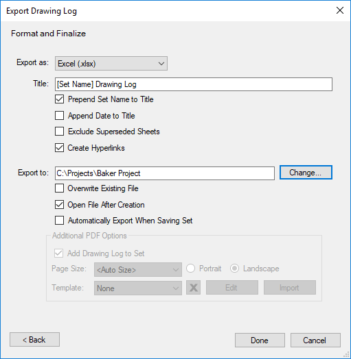 - Export To: Enter the desired save location of the drawing log or select Change and choose the save location.