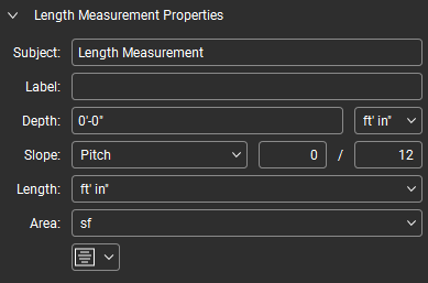 Slope: Describes the slope ratio for the measurement, allowing for accurate calculations of materials over a sloped plane. To set a slope, select a unit of measure for it (Pitch, Degree, or Grade) and enter the value in the corresponding field.
