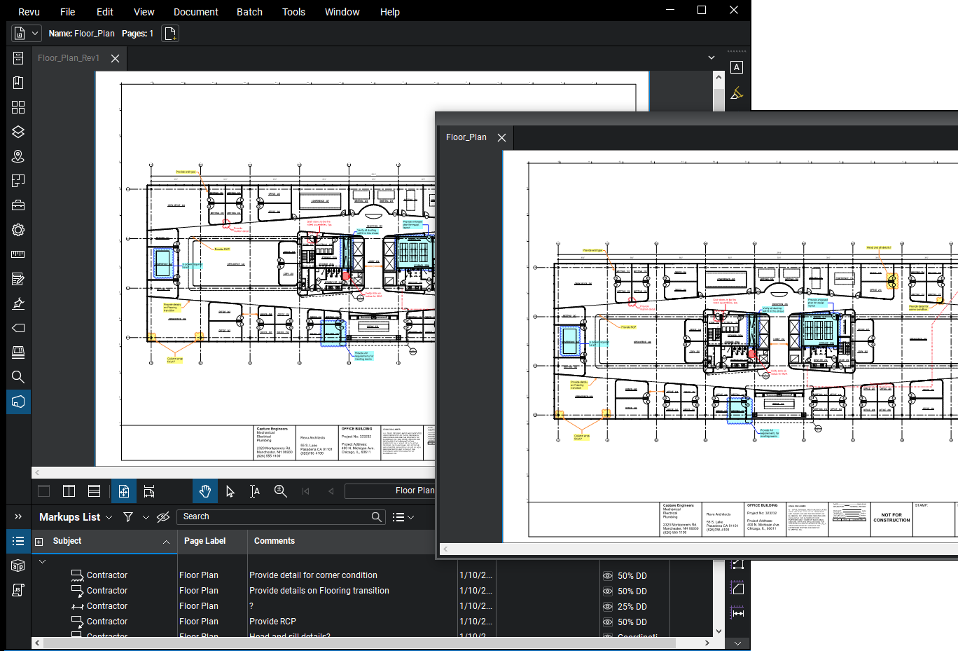 Revu's exclusive MultiView feature enables breaking the workspace up into multiple splits that can be synchronized. Additionally, MultiView Extended allows a document tab to be separated from the main workspace into a stand-alone, detached workspace.