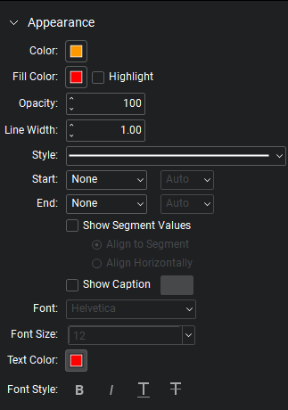 Show Segment Values: Shows all measurements available for the markup. When enabled, select an alignment for the measurements, either equal to the angle of the segments or horizontally.