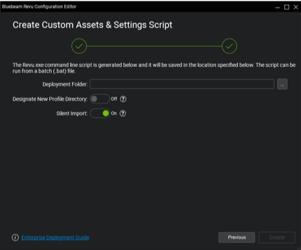 Si necesita crear configuraciones y activos personalizados como se mencionó anteriormente, deberá instalar Revu manualmente en una máquina para poder crear y preparar estos activos, como se describe en la sección Configuración de red administrada de la Guía de administración de empresa de Revu 2019.