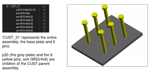 Parts may be grouped together to form assemblies, or functional groupings, of 3D elements. A graphical example of this relation is described in the following diagram.