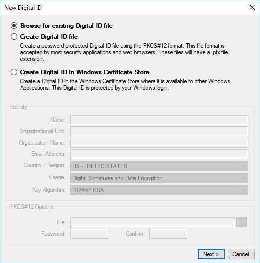 - Create Digital ID file: Creates a digital ID in the PKCS #12 format. It is protected by a separate password that is defined at the time of creation.