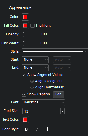 The appearance of the Polylength measurement is configurable, including its line and fill color, line width and style, opacity, and font characteristics for the caption.