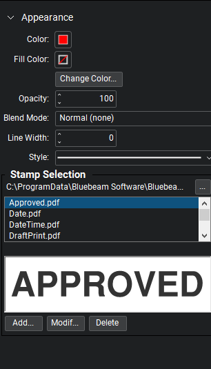 You can change the appearance of a Stamp markup, including its border and fill color, opacity, line width and style, and its blend mode.