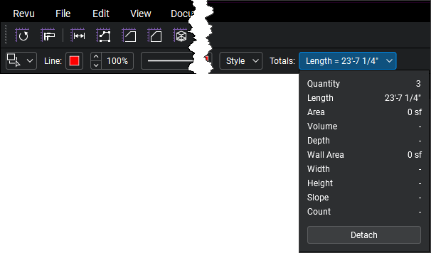 The Dynamic Properties Toolbar shows different information depending on what is currently active in Revu. In the case of measurements, this includes a Totals subpanel.