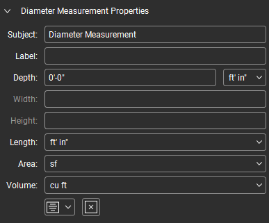 Depth: Defines the depth for the selected measurement, which is used to calculate volume and wall area. Can be set before placing the measurement (but after an applicable measurement type is selected) or after selecting an existing markup.