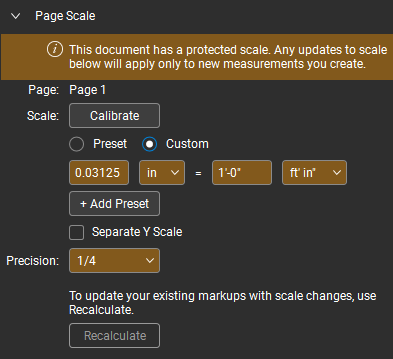 The Page Scale section shows the document scale and measurement precision. To ensure the accuracy of measurements, takeoffs, and so on, check that the scale is set correctly.