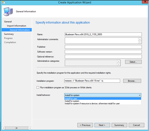 Lors de la création d'un package d'applications MSI, la sélection du comportement Installer pour l'utilisateur peut être utilisée à la place du compte SYSTÈME (Installer pour le système). Cette méthode d'installation permet à l'utilisateur connecté sur la machine cliente d'installer Revu.