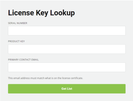 En sélectionnant l’option Vérifier les licences sur la Page d’accueil, vous accédez à la Page de recherche de clé de licence, où, une fois que vous avez saisi le Numéro de série, la clé de produit et l’adresse e-mail du contact principal, vous verrez toutes les informations associées à votre licence.