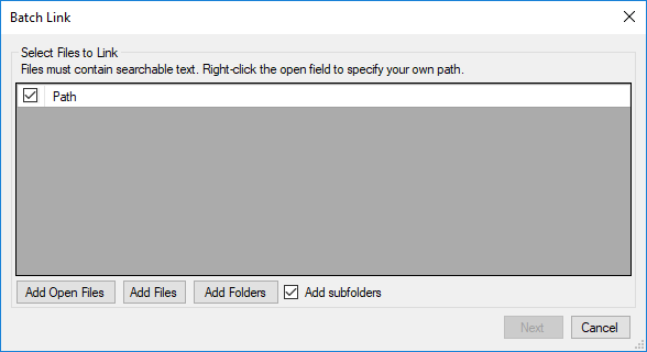 Batch Link searches PDFs for text specified by the user and then creates links to user-defined destinations. There are built-in tools to auto-generate both search terms and destinations, or users can manually enter them.