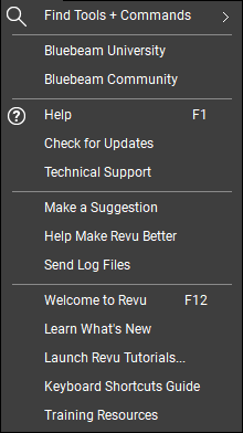 Help: Opens the Revu User Manual website in the main workspace.