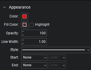 The Polyline tool draws a segmented line. Polylines can be configured so that their start and end points touch or overlap, but they are still considered open lines. For closed shapes, use the Polygon tool. Polylines can also utilize curves and arcs.