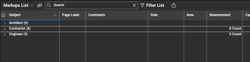 Page Index: Shows a numeric value indicating on which page the markup or measurement resides. Page Index is a useful column to use for sorting when exporting to spreadsheet programs.