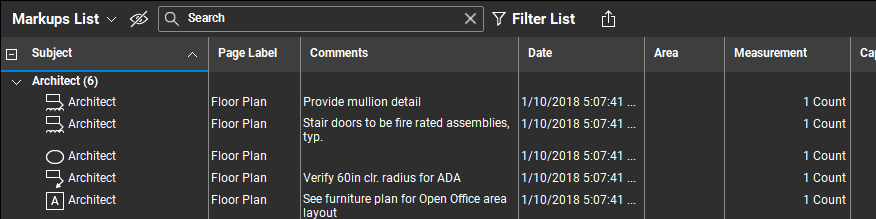 Not all columns are necessarily shown in this list. For details regarding how to hide or show other columns, and how to create custom columns, see Using the Markups List.