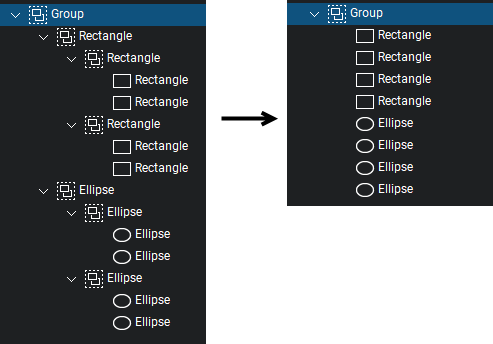 A nested group can also have its nesting structure completely removed, resulting in the markups being in a single, unnested group, as illustrated below:
