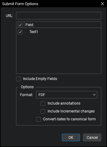 - Submit Form: A form may be submitted in PDF, FDF, or HTML form to a URL waiting for submittals. Click Options to configure submission options.