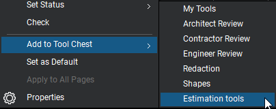 The estimation process is just one instance in which you might want to create a custom tool set. The instructions below use estimation as an example, but the same principles can be used to create a custom tool set to suit any task in which you plan to reuse markup or measurement tools. For more general information, refer to Working with the Tool Chest.