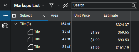 In the Markups list, you should now see the Unit Price reported as $1.99 and the Estimate reported as the product of the square footage you measured times $1.99.