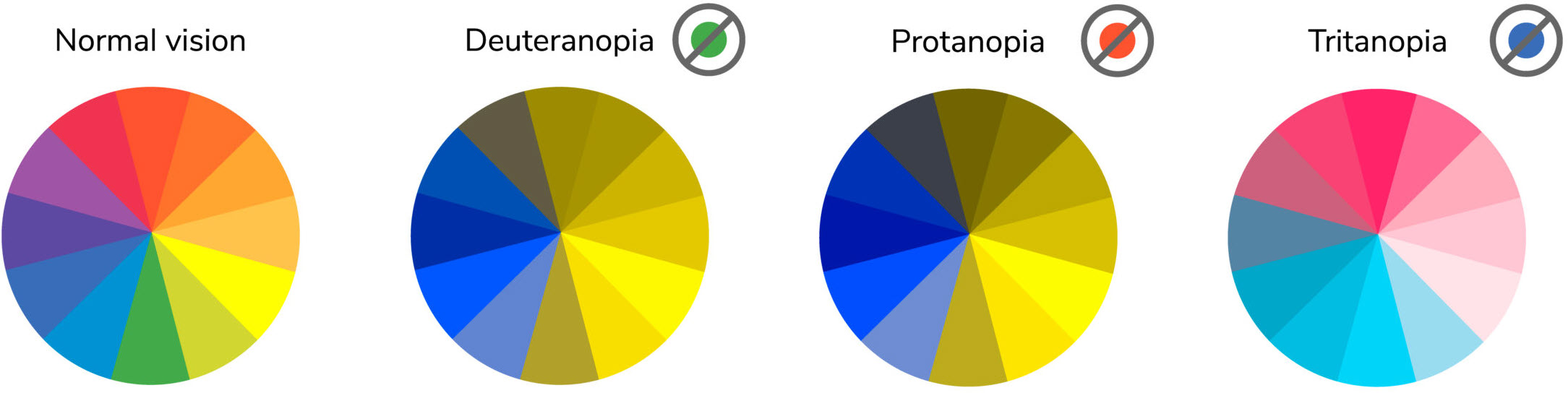 下の各ホイールは、CVD 患者が同じ色をどのように認識するかを示しています。症状の重症度は人によって異なることにご留意ください。