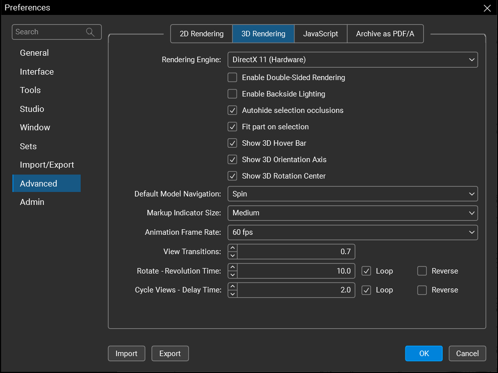 Show 3D Hover Bar:Controls whether or not to show the floating toolbar over the 3D model view in the PDF. If disabled, the functionality is still available in the 3D Model Tree tab.