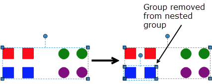 It is possible, however, to remove individual groups or markups from a nested group. This method extracts any group or markup from the nested group, no matter what nesting level they exist on, and removes them from the nesting hierarchy entirely. When a group is removed in this way, it preserves its own grouping. Similarly, when a nested group is removed this way, it retains its own nesting hierarchy. See the illustration below for an example of removing an individual group from a nested group.