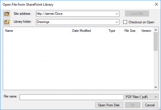 If Always Show Selection dialog is not enabled in File Access Preferences, the Open File from SharePoint Library dialog opens directly. - Select the desired SharePoint site from the Site address dropdown list.
