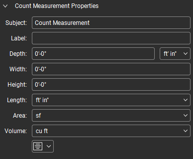 Depth: Defines the depth for the selected measurement, which is used to calculate volume and wall area. Can be set before placing the measurement (but after an applicable measurement type is selected) or after selecting an existing markup.