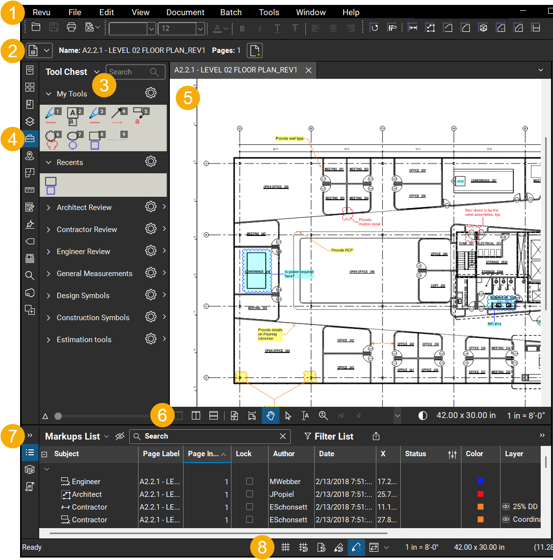 The Revu interface is largely driven by a menu bar as well as customizable toolbars and panel tabs.