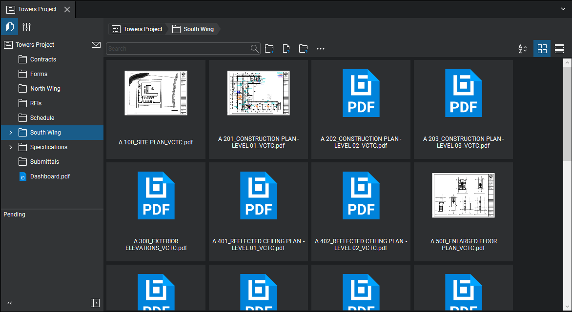 When viewing a Studio Project tab, there are multiple ways to navigate to Project files, including a folder tree on the left of the tab and either a thumbnail or list view on the right, depending on which is currently selected. A useful feature of the thumbnail view is that PDFs that have been cached to your local device will show a preview of the document, while uncached PDFs will show a generic PDF icon, making it easy to see which PDFs are ready to be viewed offline. You can cache additional files by opening them while online. For more information about working with the files in a Project, see Working with Files in a Studio Project.