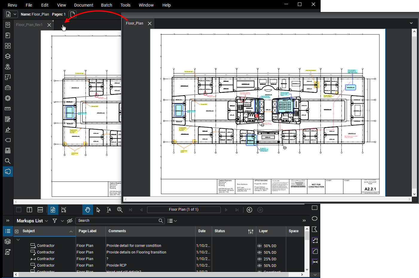 Revu's exclusive MultiView feature enables breaking the workspace up into multiple splits that can be synchronized. Additionally, MultiView Extended allows a document tab to be separated from the main workspace into a stand-alone, detached workspace.