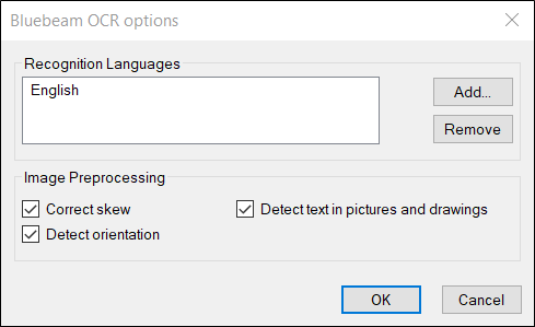 After taking the picture, the Bluebeam OCR options dialog box appears.