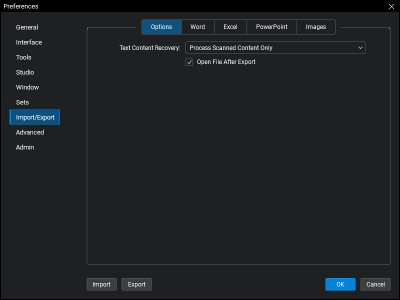 The Import/Export Preferences contain settings for importing content into a PDF and exporting PDF content into other formats in Revu. Select Export from the Preferences dialog box to view or modify these preferences.