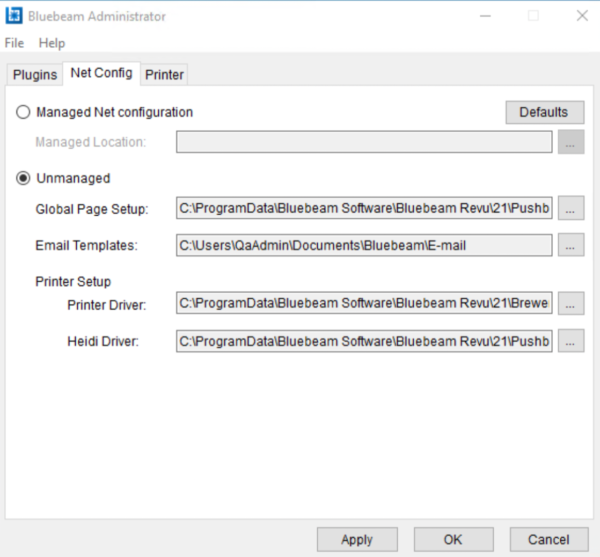 [HKEY_CURRENT_USER\Software\Bluebeam Software\21\Plugins]"ManageNetConfig"="1""ManageNetConfigPath"="U:\\netconfig\\"