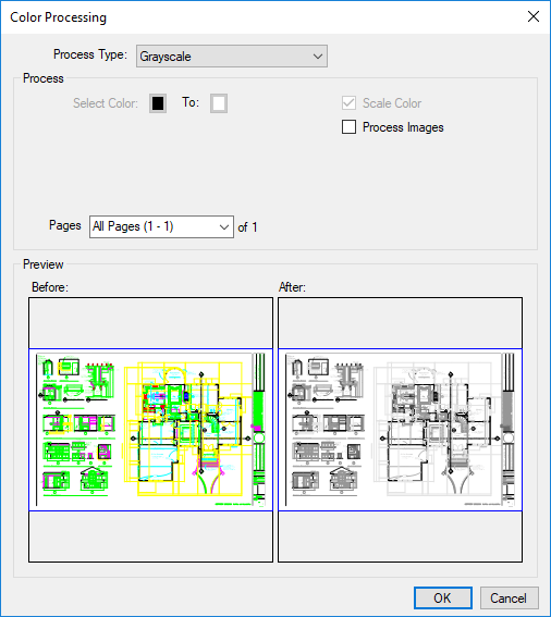 - Scale Color: Clear Scale Color to process all colors to a single color. For example: Clear Scale Color and select black to create a black and white PDF.