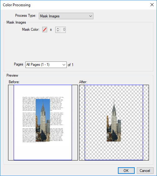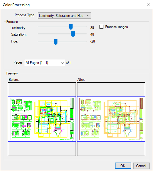 Use the Color Processing tool to manipulate the colors of a PDF. Selected colors can be changed to other colors, color PDFs can be changed to grayscale or black and white, color properties like luminosity, saturation and hue can be manipulated, and transparent areas can be created in images.