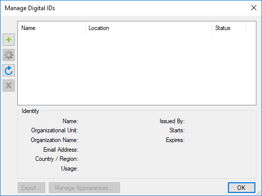 This topic discusses the creation and management of self-signed digital IDs. If you purchase a digital ID from a third-party Certificate Authority, you shouldn't need to create a digital ID in Revu. If you're uncertain whether you should use a self-signed digital ID or a digital ID purchased from a third-party Certificate Authority, the Digital Signatures Tutorial discusses the merits of both options.
