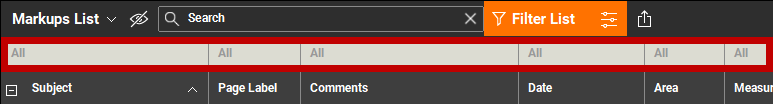 Markups can be filtered by any or all columns in the Markups list. When filtering is turned on, a new filter header row appears from which you can set filters.