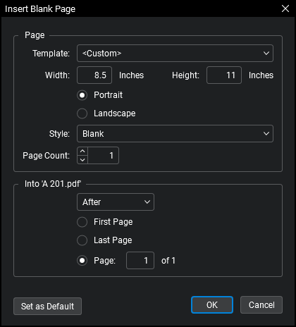 Insert Blank Page. The Insert Blank Page dialog appears.