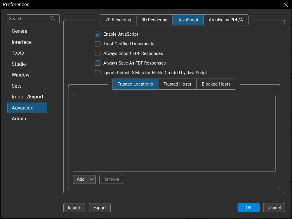 Trust Certified Documents: When enabled, Revu allows PDFs that it recognizes as "trusted" (either because they have been specifically designated at such or because they are in a "trusted" folder) to execute JavaScript functionality that is normally disallowed for security reasons, including having the ability to read local files and access the Internet.