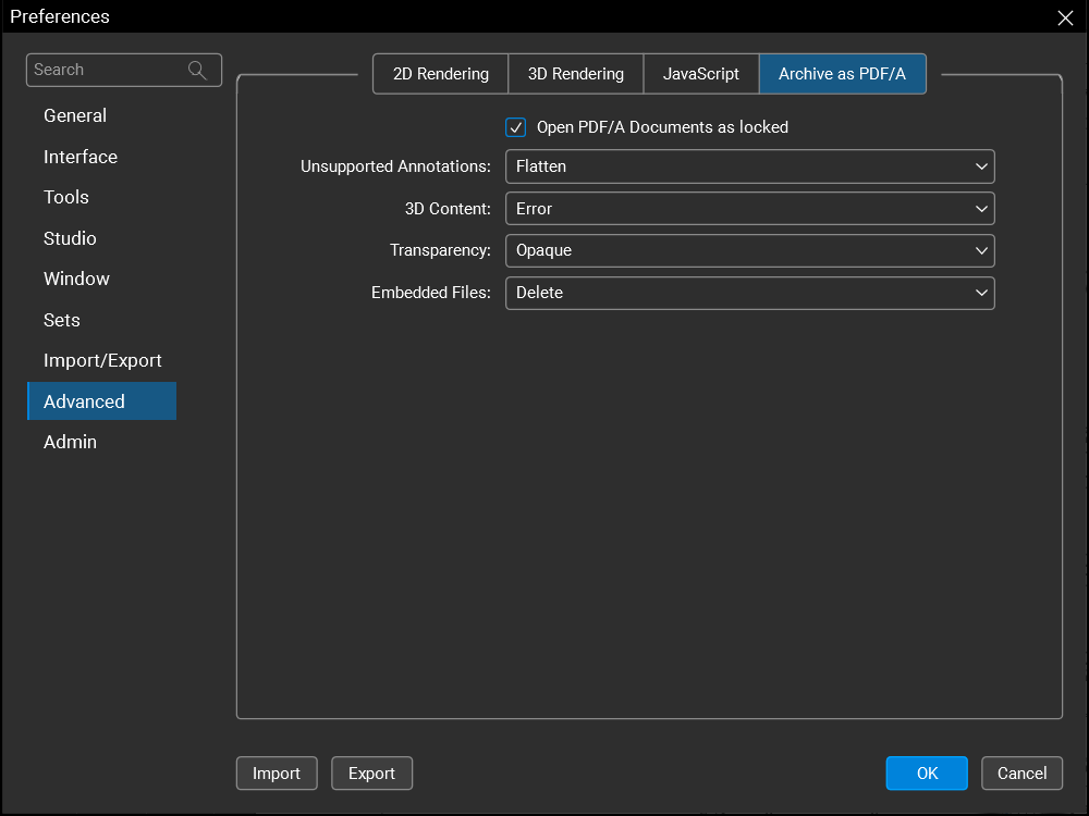 Open PDF/A documents as locked: When enabled, PDF/A files are opened as locked for editing. This prevents the file from being changed and voiding the PDF/A compliance. Locked PDF/A files can be unlocked so it can be edited.
