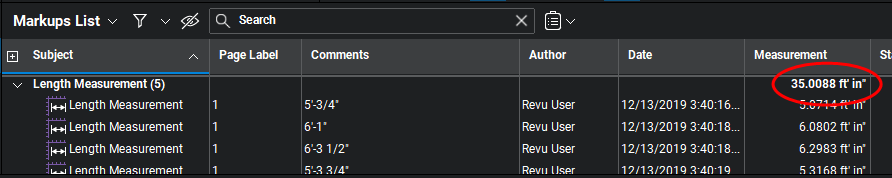The Markups List will show a running measurement total of all measurements of the same type within a document. This total is shown at the top of the Measurement column.