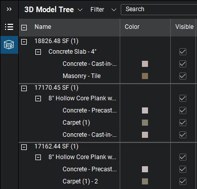 Search: Filters the 3D Model Tree list based on the text entered in the field. Select X in the field to clear the search term.