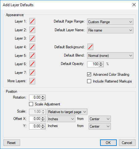 - Appearance: Sets the default line color of the Layers. To change the default line color for a Layer, select the color box and select the desired color.