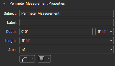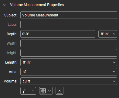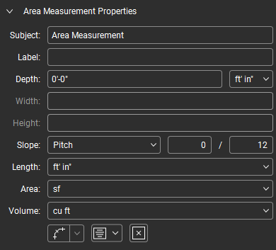 Depth: Defines the depth for the selected measurement, which is used to calculate volume and wall area. Can be set before placing the measurement (but after an applicable measurement type is selected) or after selecting an existing markup.