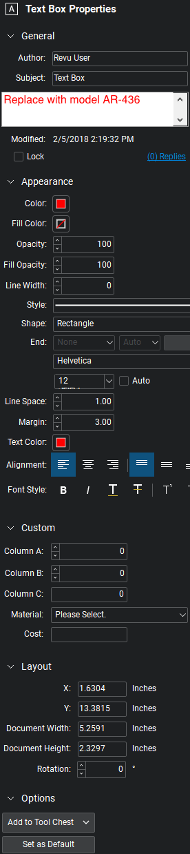 Presents two options for saving the selected properties of the markup for future use. Select Add to Tool Chest and select a tool set. Set as Default saves the Appearance settings and uses them when you create another markup of this type.
